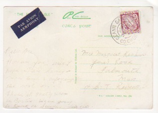 The postcard is from Catherine Cronin to her sister Margaret Keohane, Jones Road, Falmouth, Mass ℅ C T Russell - it is postmarked from Kinsale - Sean Saile. I think the rest of the postmark is County Cork in Irish - Co. Chorcai.