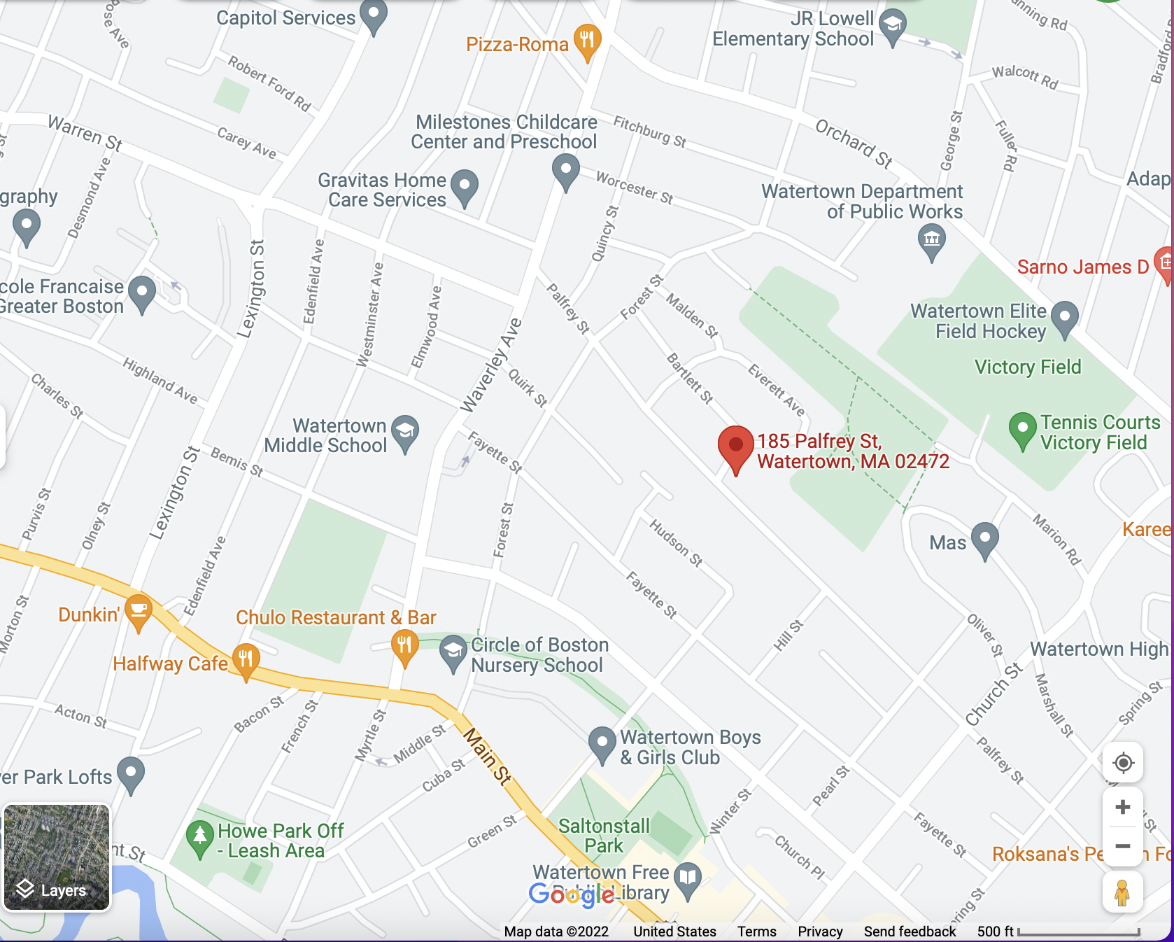 9 Patten Street is the red icon at the bottom right where Herbert Vaughan had moved - you can see Edenfield Ave up Main Street just below the Watertown Middle School.