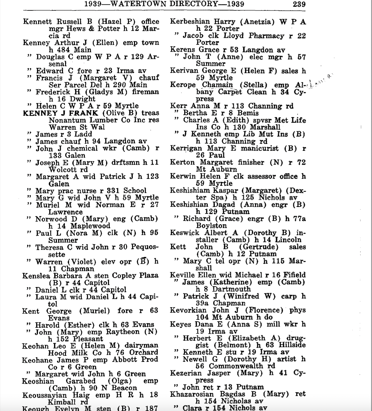 The names of the neighbors on Green Street, Chestnut Street, and Green Street Terrace sound so familiar to me - a lot of the families were still there in the 50s when I was growing up. Bunny Callahan had moved up Green Street a couple of doors. One day Bunny actually drove me and my mother in his town truck to Dr Baron's up Main St. on the Watertown/Waltham line - I had tried to stop the back door from slamming and my hand went right through the glass - I ended up with stitches in my right wrist. Maybe we can take a look at these neighbors later.
