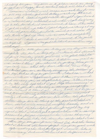 I got a letter from you today so my day was indeed complete. I'll have a long dry weekend but I'll make up for it Monday if all goes well. I'm glad that dear Uncle Sam has finally decided to deliver my mail as was about time. You should be getting them quite regularly now that they have started. For writing material you are certainly scraping the bottom of the box but as long as you write I don't care what you write on. I appreciate your letters very much and missing you so desperately your letters seem to be the only lift that I get. Keep them coming! I see that you are starting a savings campaign and I want to thank you. Every little bit helps us out tremendously and although you may not realize it now in a year or two when the fast easy dollar days are a thing of the past all that we have saved will come in mighty handy and we will both be thankful for our foresight. My big regret is that I didn't get acquainted with a savings account a few years sooner when I was throwing money around like the drunken sailor that I was. Those days are gone forever, thank God, but the lessons that I learned I'll never forget. Keep up the good work.