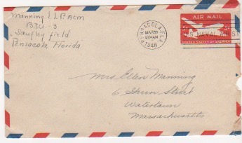 Uncle Sam seems to be on the ball in delivering my mail to you. It takes an extra day for your mail to get to me because the main base picks up all Navy mail and holds it up a whole day sorting it and distributing it to outlying fields. Everything seems to be delayed down here. Incidentally I sent Aunt Nellie and Aunt Hannah an Easter card today so I guess I'll remain in their good graces a while longer, I hope. I was going to send you some flowers for Sunday but it would really put a terrific dent in my reserve that I have set aside for your arrival down here. I hope that you understand and won't mind too much. It must have broken Miss Mac's heart to give you that extra day off or maybe that accident has really affected her somewhat. It's all for the best if that extra day is any indication. The time (is) approaching rapidly honey so you had better make your reservations in the very near future. Get a round trip ticket to Pensacola and back. It should run up to a little over $150. When you get down here we can really talk about our future and all of these ideas that I have developed in the past few days. All that talk about low teachers pay is only incidental. With all of the publicity they should be getting an increase soon. Nevertheless I'll try.