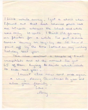 "I took while away. I got a shock when I found out that each colored photo cost me 40 cents whereas the black and white were only 10 cents. I think I'll go easy on photos for a while. I've put a movie camera on lay-away so I'll have it paid off by the time I start my working holiday next year.